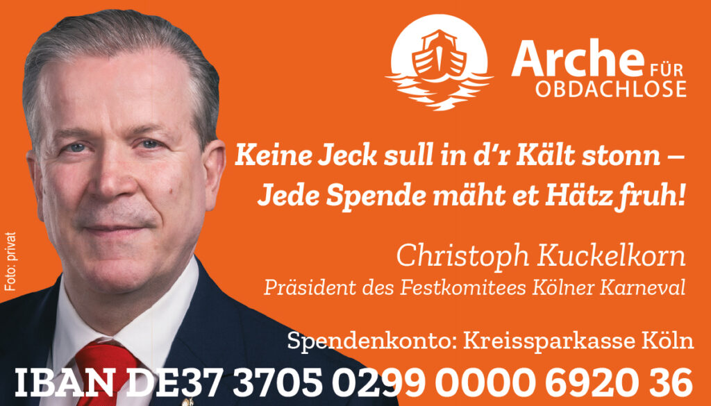 Der Präsident des Festkomitees Kölner Karneval, Christoph Kuckelkorn, bittet um Spenden für die Arche für Obdachlose: „Keine Jeck sull in d‘r Kält stonn – Jede Spende mäht et Hätz fruh!“