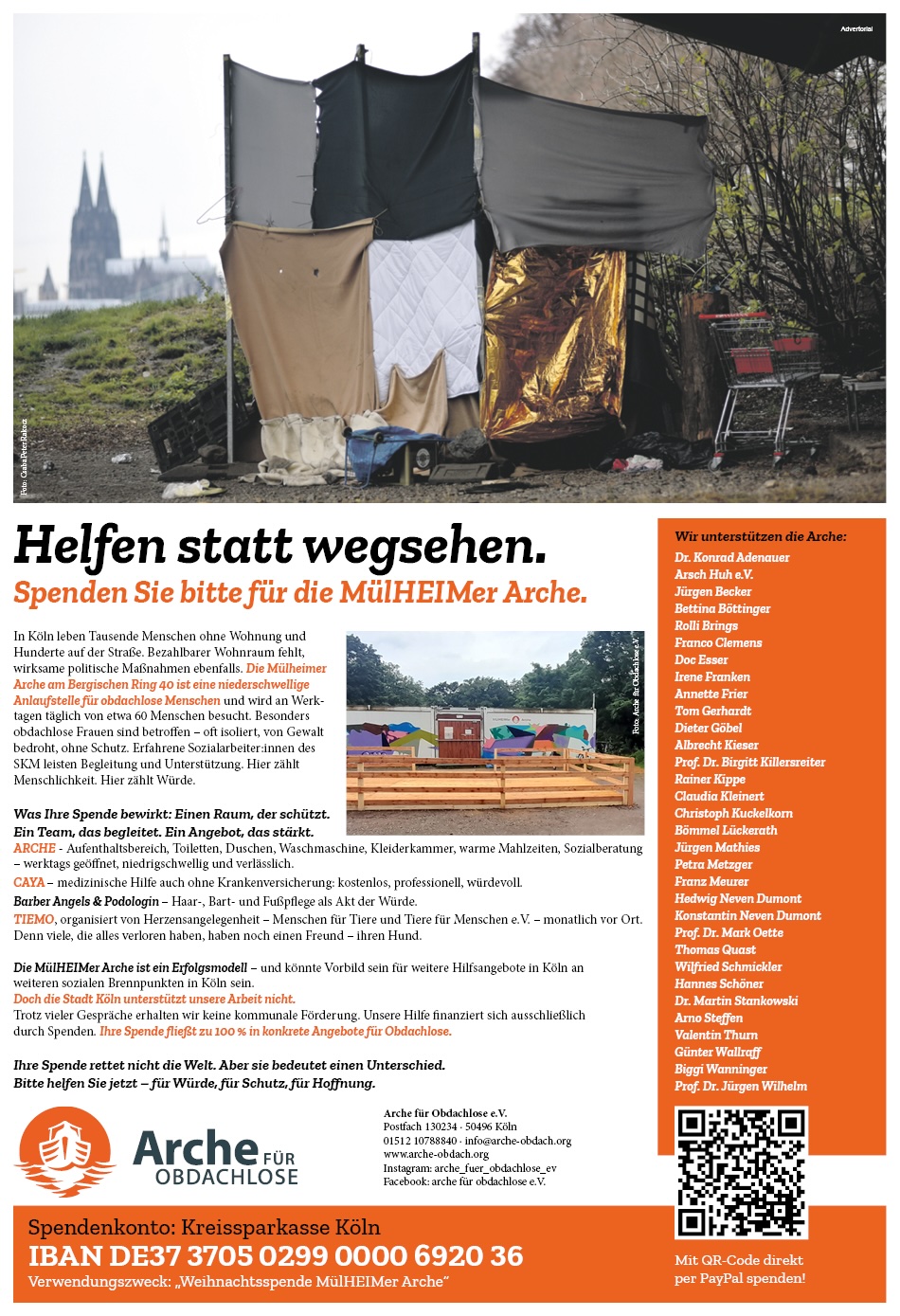 In Köln müssen hunderte Menschen auf der Straße leben. Die Obdachlosigkeit nimmt in Köln zu! Arche für Obdachlose e.V. bittet um Ihre „Weihnachtsspende MülHEIMer Arche“.