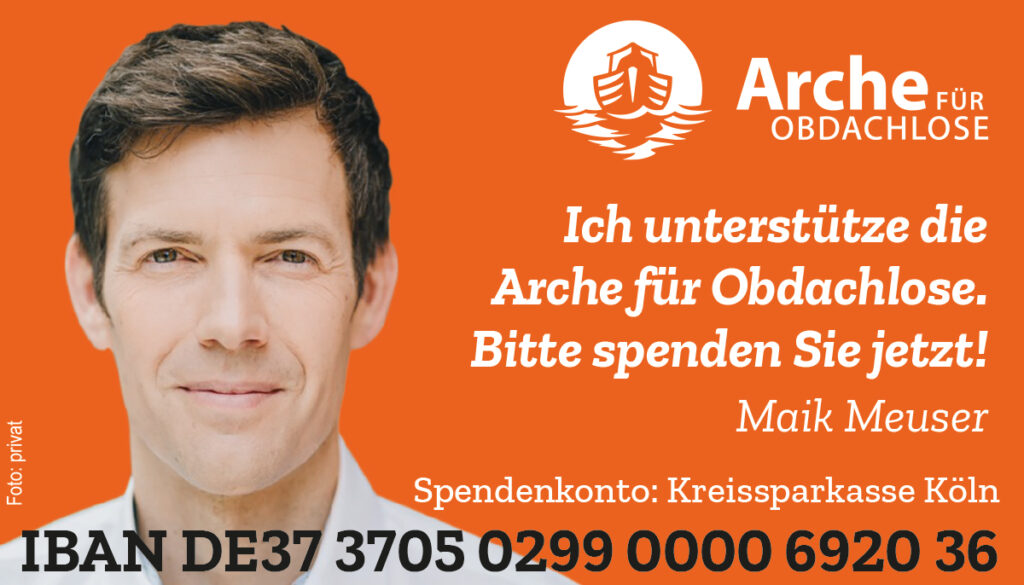 „Ich unterstütze die Arche für Obdachlose. Bitte spenden Sie jetzt!“, dazu ruft Maik Meuser, Journalist und Fernsehmoderator, auf. Denn jeder Euro hilft, unsere Hilfe-Einrichtung „Mülheimer Arche“ in der Nähe des Wiener Platz weiter fortführen zu können. Sie wird ausschließlich aus Spenden finanziert.
